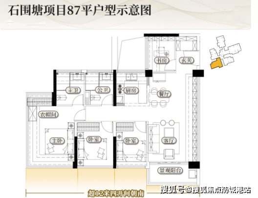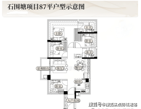 建面约87㎡四房2卫:该户型是项目的明星户型,也是刚需改改善的首选户型,规划有四个卧室和2个卫生间,四个卧室均为可正常居住的空间,并非入户花园凑数,实用性极强。该户型有两种格局可供选择,第一种格局拥有独立入户玄关,能够保护业主的居住私密性,客厅一整面墙采光+通铺飘窗,采光通风效果极佳,客厅和三个房间全南向,超过12米四开间朝南,亮点密集,能够充分享受阳光照射,提升居住舒适度;第二种格局所在梯腿为单边位,做到线米大阳台,通风效果极佳,主卧和主卫都是双面屏视野,能够欣赏到江景或社区景观,是小户型难得的U型采光设计,适合改善居住品质的家庭。
