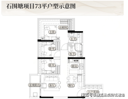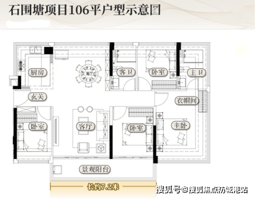 建面约106㎡四房2卫:该户型是项目的改善型户型,全部为单边位设计,可以看作是87平边户的“升级版”,规划有四个卧室和2个卫生间,空间更加阔绰,居住舒适度更高。户型格局与87平边户相似,但整体空间更大,阳台加长到约7.2米,连通客厅和次卧,增加了阳台的使用空间,日常可作为休闲、晾晒、观景等多种用途;入户区域从书房升级为标准次卧,能够满足家庭更多的居住需求,可作为老人房、儿童房或客房;主卧更加阔绰,配备独立卫生间和衣帽间,私密性和舒适度拉满,能够满足改善家庭的居住需求;整体户型南北对流,采光通风良好,景观视野极佳,适合人口较多的改善家庭或对居住品质有较高要求的购房者。